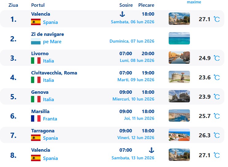 Imbarca-te din Valencia pe 06 Iun 2026 si viziteaza 6 orase din 3 tari.