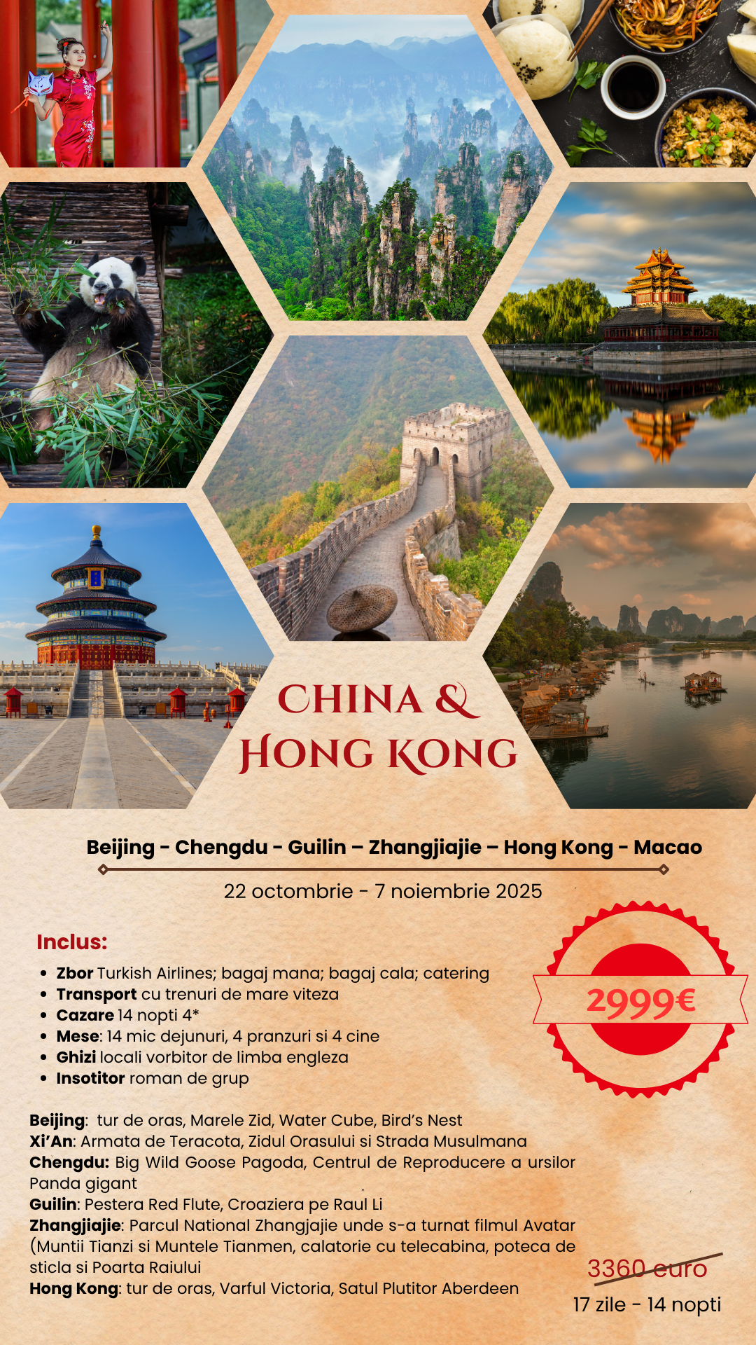 Un circuit gândit pentru cei care vor să vadă tot ce contează în China – dar fără compromisuri. 15 zile, 6 orașe, trenuri de mare viteză, natură spectaculoasă, istorie milenară și cultura unei lumi care nu încetează să surprindă.